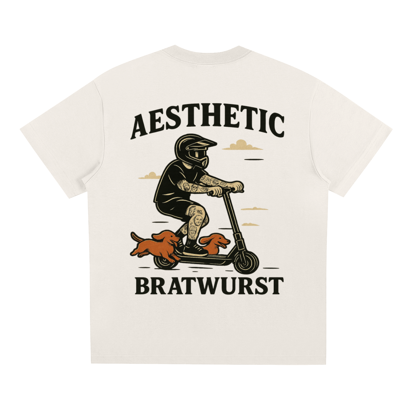 Bring humour and bold style into your streetwear rotation with the AESTHETIC: Bratwurst tee. Printed on a crisp white heavyweight cotton shirt, the back features a striking illustration of a tattooed rider in full gear cruising on a scooter, flanked by two sausage dogs sprinting alongside. The bold vintage-style typography—AESTHETIC up top and BRATWURST below—frames the artwork, creating a perfect mix of rebellious energy and tongue-in-cheek humour.